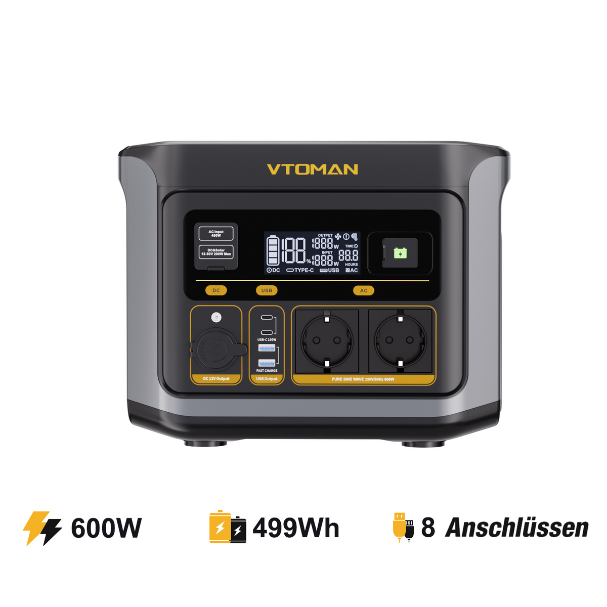 La VTOMAN FlashSpeed 600 è una power station compatta e ad alte prestazioni, progettata per fornire energia affidabile durante attività outdoor o in caso di emergenza domestica. Grazie alla potenza di uscita di 600 W (fino a 1200 W di picco) e alla capacità di 499 Wh, garantisce autonomia e versatilità in ogni situazione.